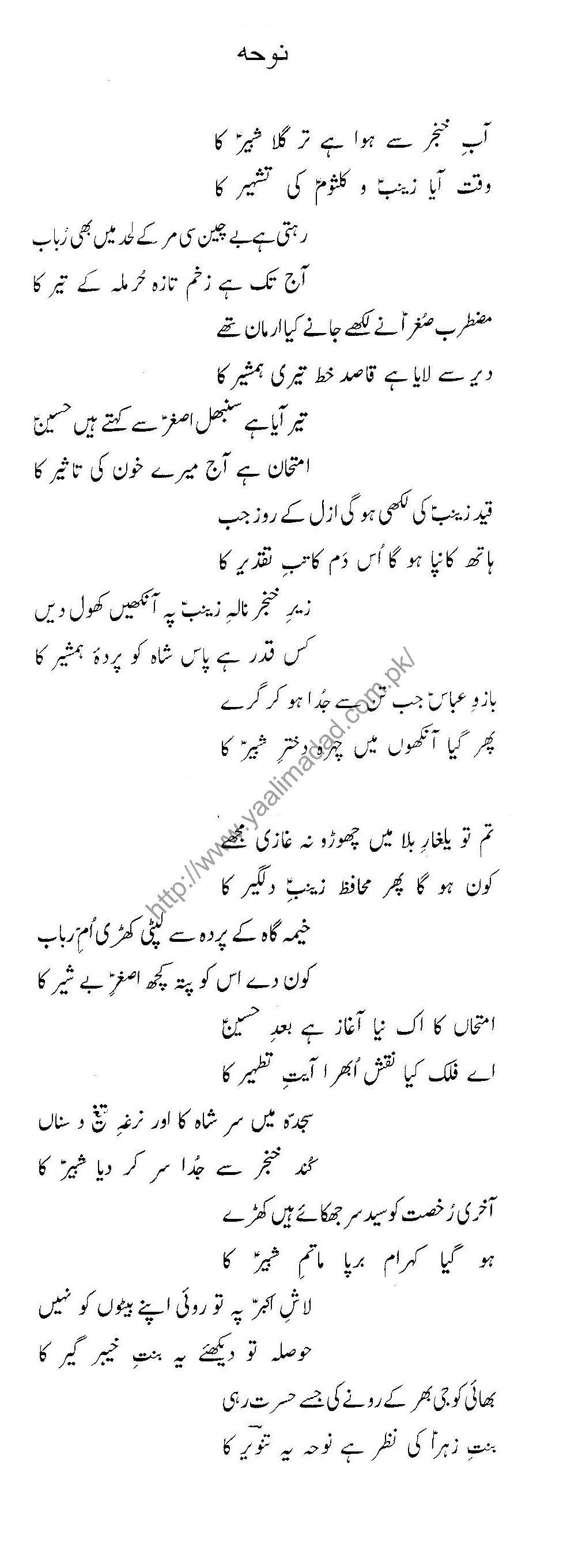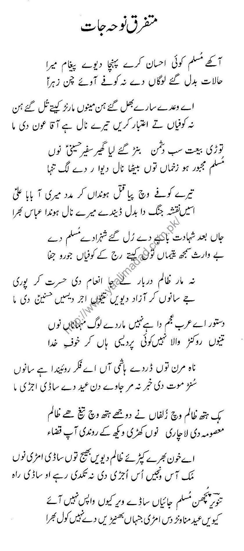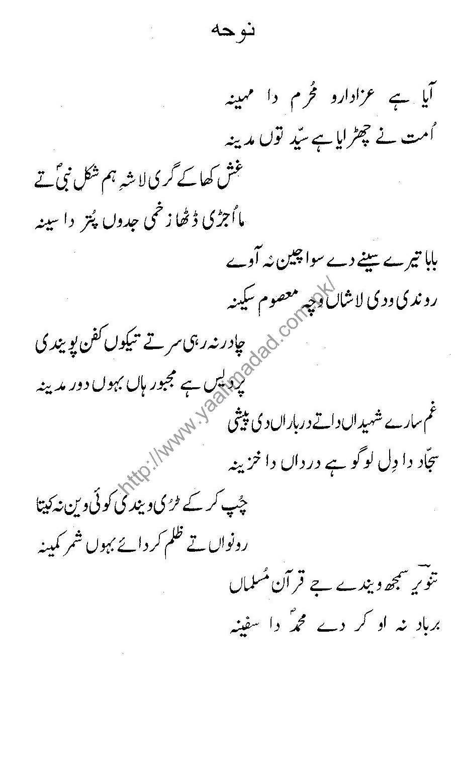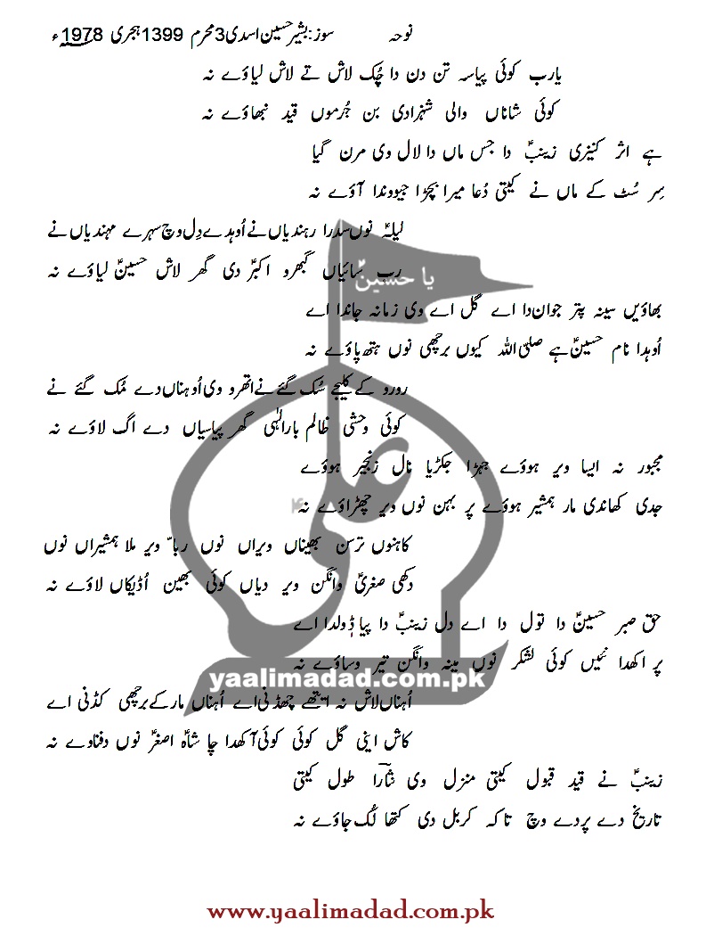 Wekhya Bhaina Nay Lasha Yasrab Kay Rastay Pay Mola Ya Rab Koi Piyasa Tin Da Zalima Nay Charaya Naizay Tay Sir Zanib Ki Aho Zari Aur Lash Murtaza Ke Zanib Wairn Karay Tay Aakhay Zia E Khoon-e-Sheehdan Ab e Khanjar Say Hua Hay Abid Di Jawani Nun Ahmad Kay Nawasay Ka Aja Ali Asghar Tumhain Akaili Reh Gaye Bhai Gayay Akhay Muslim koi Ehsaan Karay Ao Asghar Tumain Hamsheer Asghar Day Nazuk Gal Vich Asghar Ki Pyas Daikh Asghar Tumhain Sakina Ashoor Ki Shab Dhalti Hay Aulaad e Mustafa Pay Qayamat Aya Hay Azadaaro Muharram Da