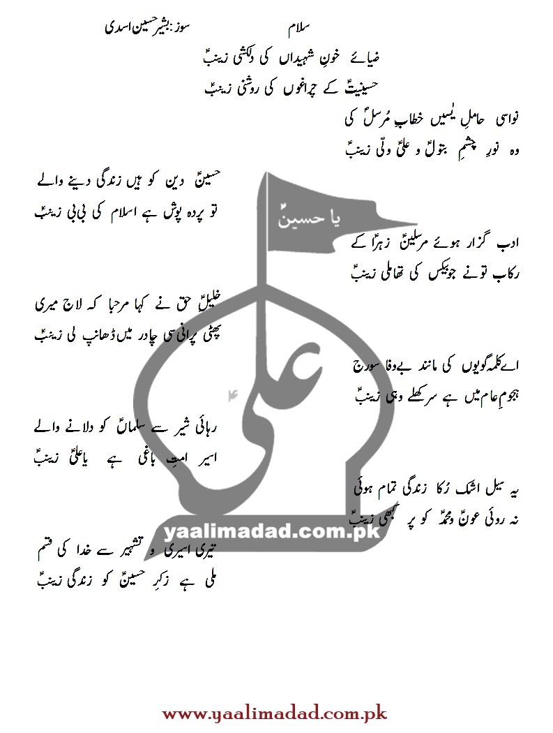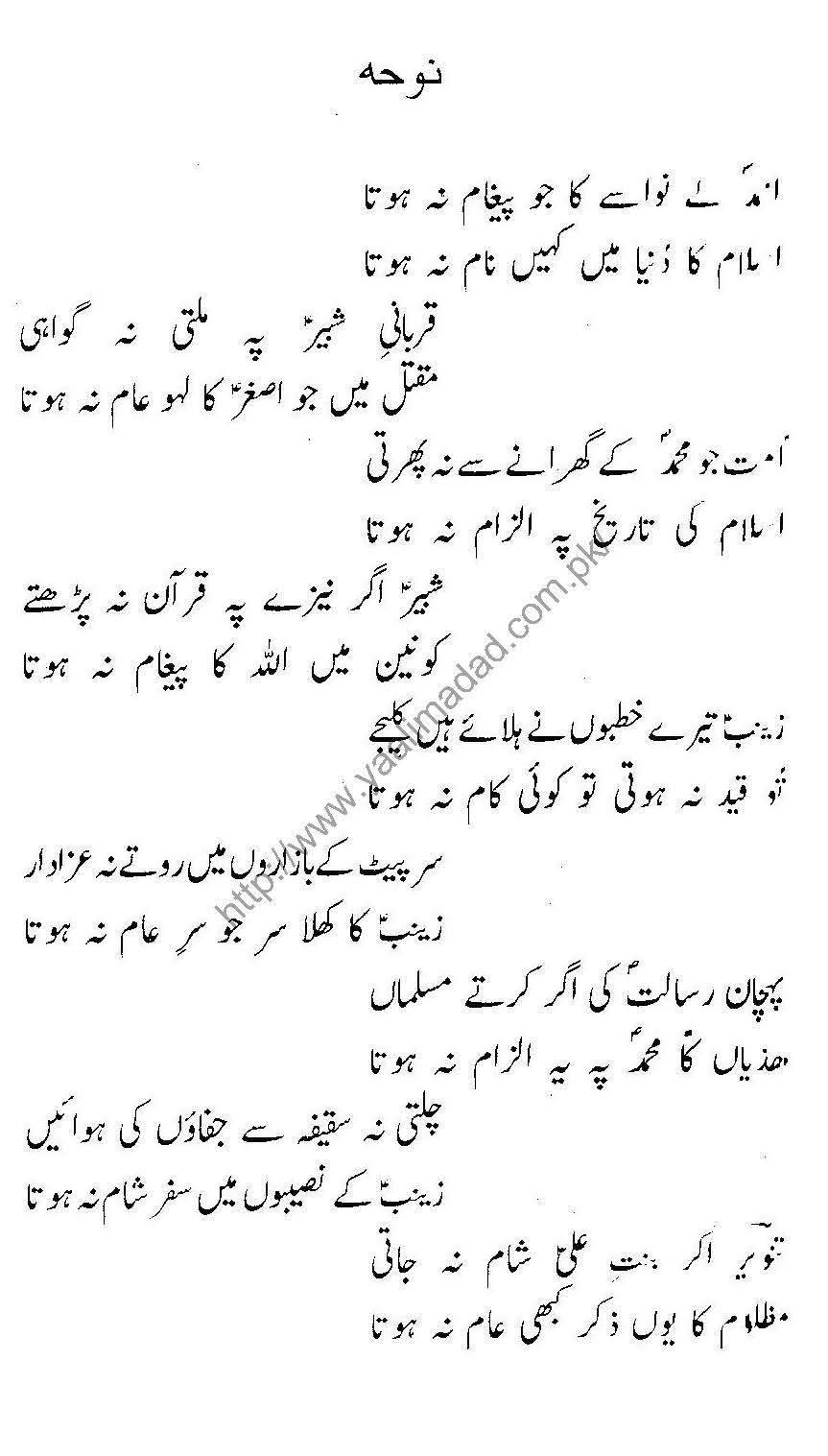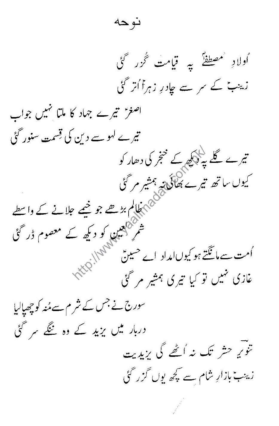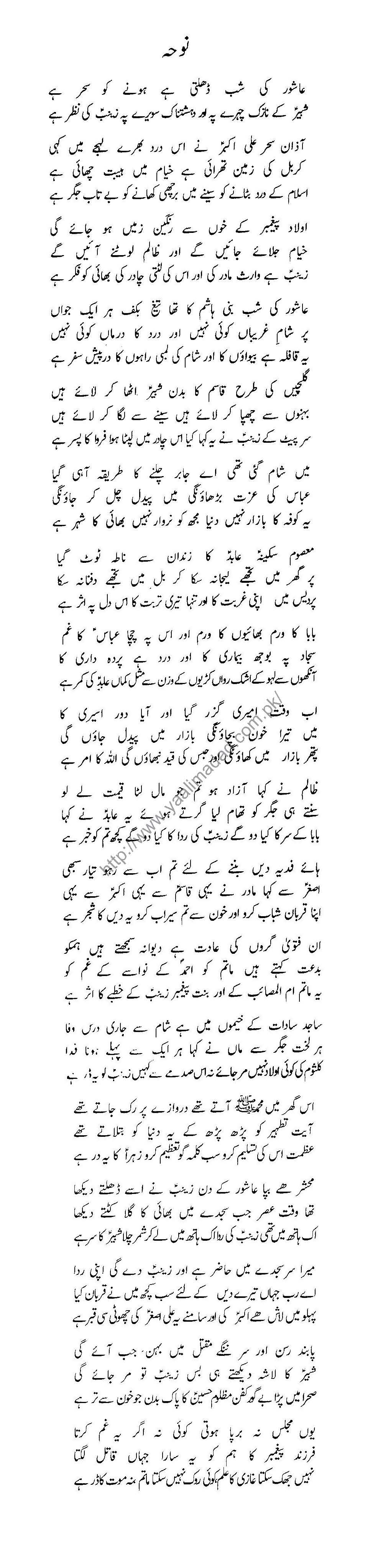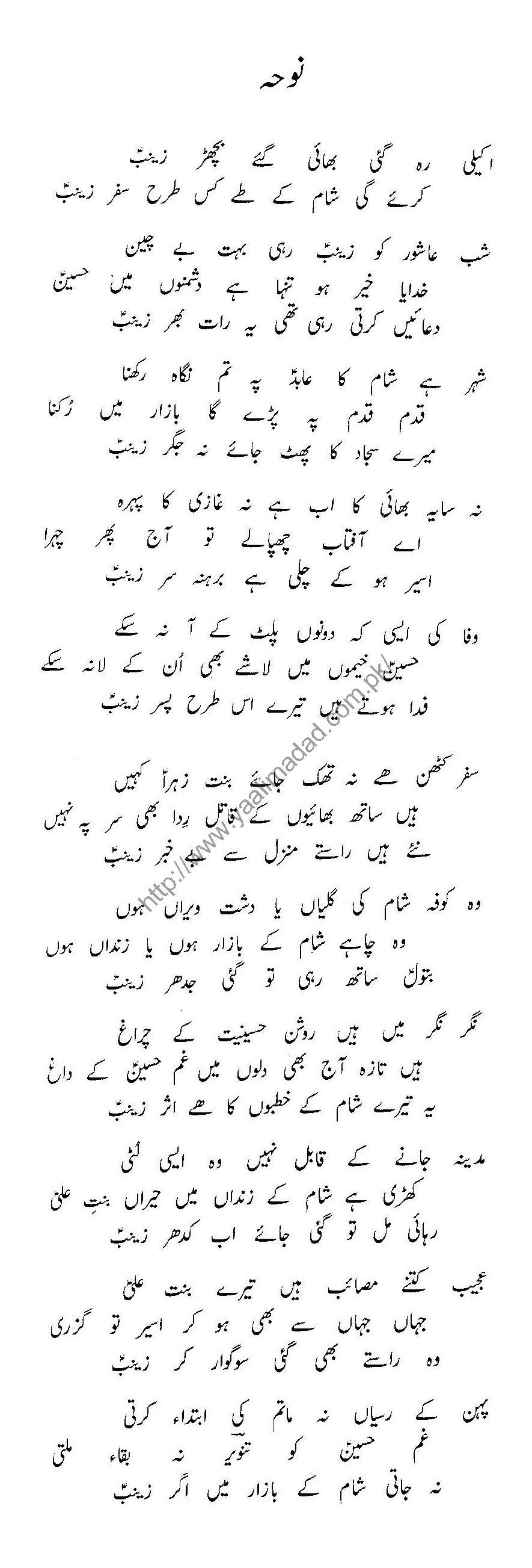 Wekhya Bhaina Nay Lasha Yasrab Kay Rastay Pay Mola Ya Rab Koi Piyasa Tin Da Zalima Nay Charaya Naizay Tay Sir Zanib Ki Aho Zari Aur Lash Murtaza Ke Zanib Wairn Karay Tay Aakhay Zia E Khoon-e-Sheehdan Ab e Khanjar Say Hua Hay Abid Di Jawani Nun Ahmad Kay Nawasay Ka Aja Ali Asghar Tumhain Akaili Reh Gaye Bhai Gayay Akhay Muslim koi Ehsaan Karay Ao Asghar Tumain Hamsheer Asghar Day Nazuk Gal Vich Asghar Ki Pyas Daikh Asghar Tumhain Sakina Ashoor Ki Shab Dhalti Hay Aulaad e Mustafa Pay Qayamat Aya Hay Azadaaro Muharram Da
